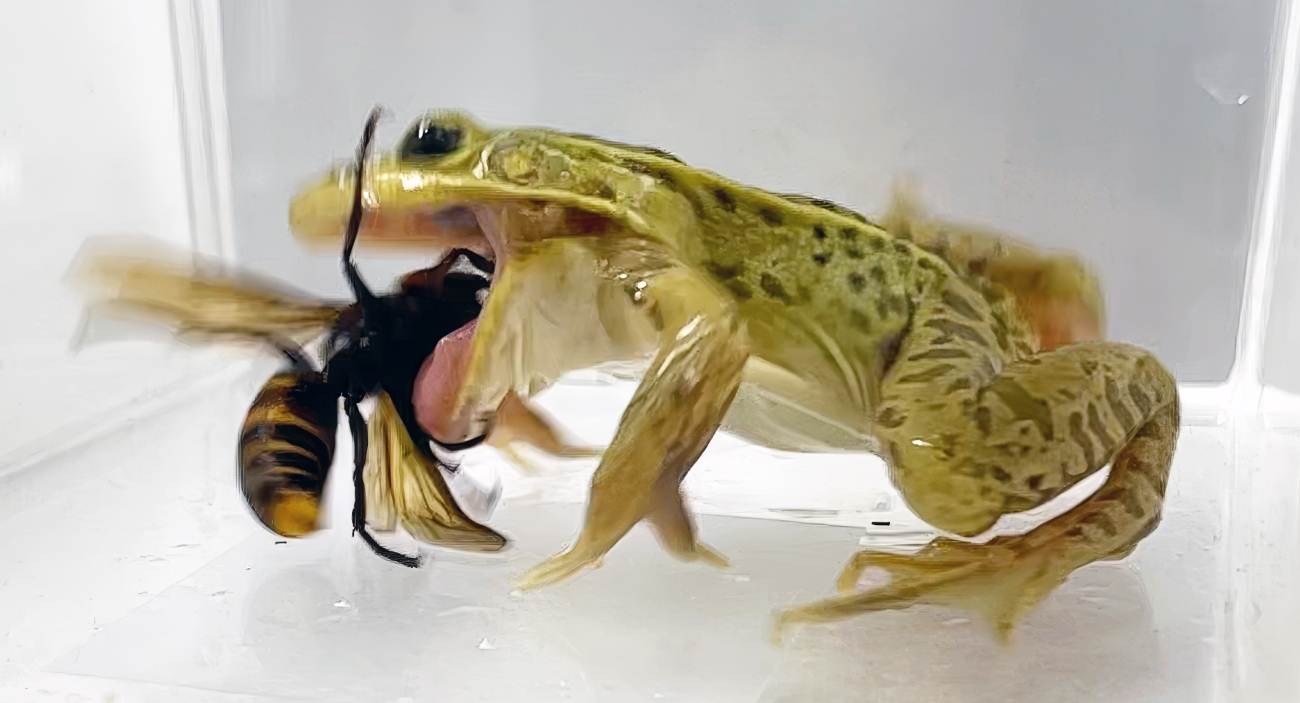Sebbene la sola vista del pungiglione di una vespa gigante sia sufficiente a riempire molti di noi di terrore, alcuni animali, come certi uccelli, ragni e rane, sono noti per predare vespe adulte. Il veleno iniettato dai loro pungiglioni può provocare un dolore acuto e intenso, oltre a danni locali ai tessuti ed effetti sistemici come la distruzione dei globuli rossi e disfunzioni cardiache, che possono persino risultare fatali. Tuttavia, se gli animali che cacciano le vespe siano in grado di tollerare le punture velenose, o semplicemente riescano ad evitarle, è rimasto poco chiaro. «Sebbene studi sul contenuto gastrico avessero mostrato che le rane di stagno talvolta mangiano vespe, nessun lavoro sperimentale aveva mai esaminato come ciò avvenga», afferma l’ecologo della Kobe University, il dottor Sugiura Shinji (1).