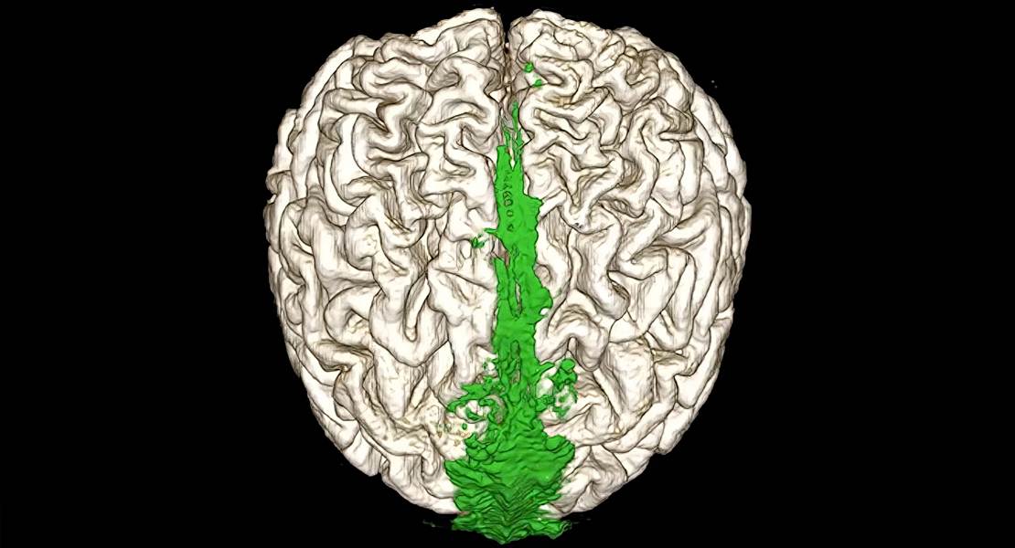 Descrizione foto: Magnetic resonance imaging (MRI) che mostra il flusso dorsale del sistema di eliminazione dei rifiuti del cervello. - Credit: Dr. Onder Albayram, Medical University of South Carolina.